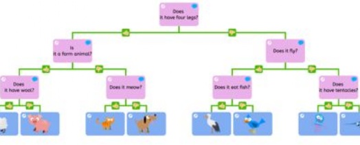 We began by looking at groups of animals and foods, and the children worked together to think of questions that would help separate them. For example, they asked questions such as “Does it have four legs?” or “Is it a fruit?” This helped them understand how computers use similar systems to organise and find information quickly.
