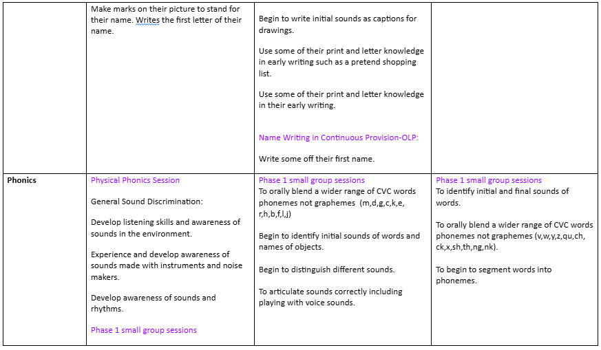 Once the children are settled into Nursery, they are introduced to Phase 1 Phonics sessions, including a range of games, songs and instruments to develop children’s speaking and listening skills.
