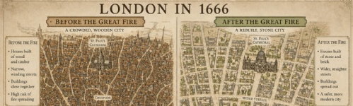 Before the fire, houses were mostly made from wood. After the fire, more houses were built with brick and stone.
