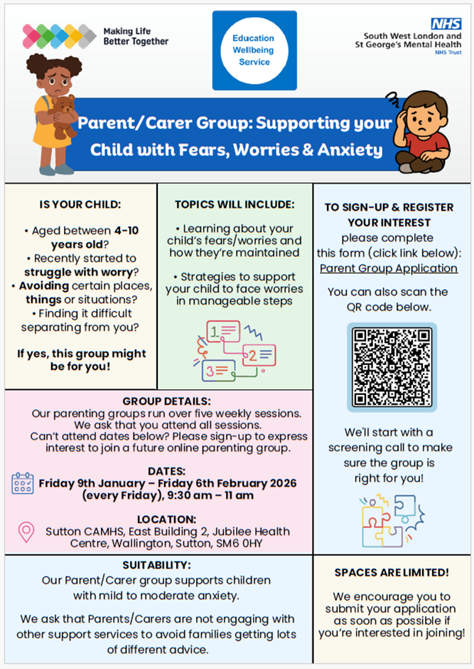 ➡️Click this link to sign-up for the group and see poster for more information (spaces are limited, so please sign up to express your interest) : Sutton Parent/Carer Group: Supporting Your Child with Fears, Worries & Anxiety – Fill in form