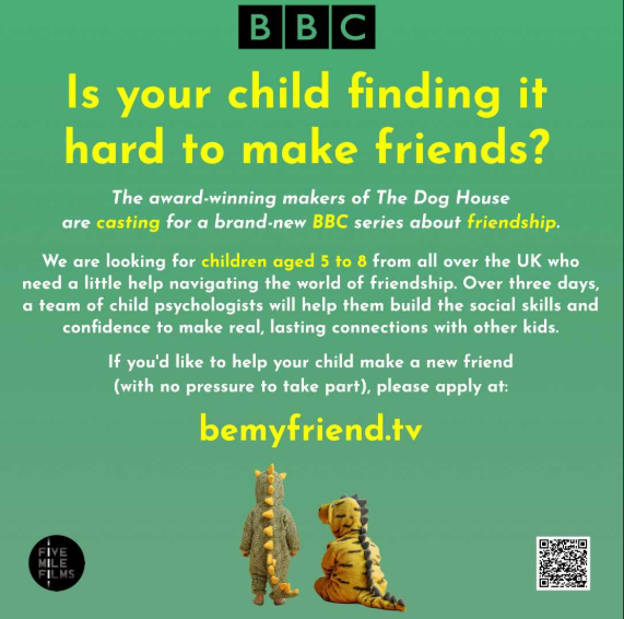 Does your child shine at home, but struggle socially around other kids? The team behind The Dog House is making a brand new BBC series about childhood friendship and are looking for kids aged 5 to 8 who are finding it hard to make friends.
