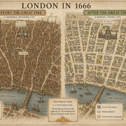 Before the fire, houses in London were close together and the streets were very narrow. After the fire, the houses were spread out more, and the streets were wider.